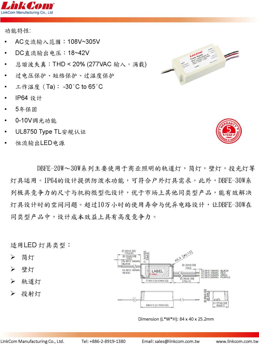 微型化 30W 0-10V调光LED电源供应器