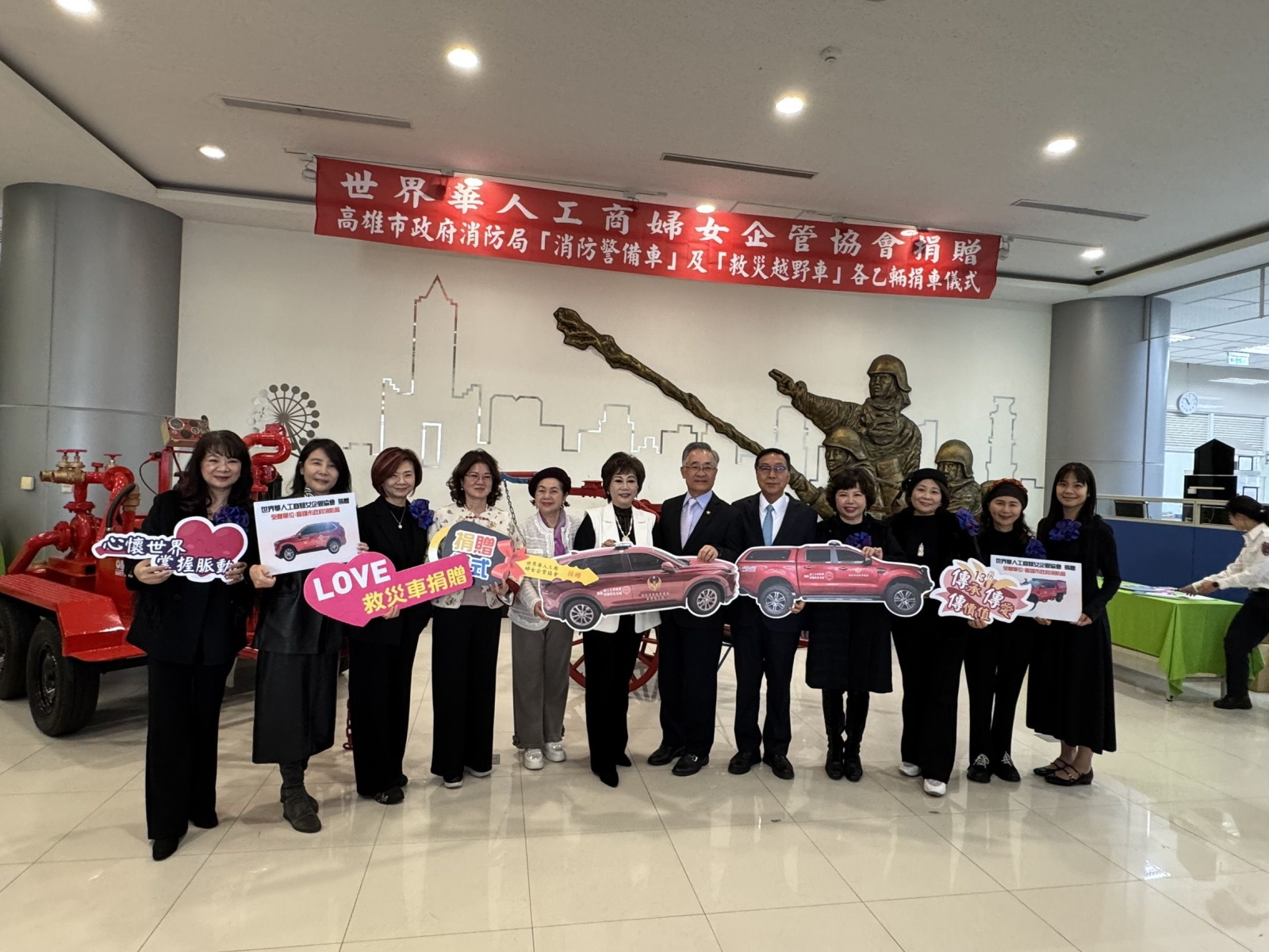 救灾车捐赠仪式于 2026 年 1 月 9 日上午 10 时,假高雄市政府消防局一楼大厅举行,谭明珠董事长亲自出席,与世华总会及地方政府代表完成捐赠仪式,象征企业、公部门与公益团体携手合作,共同强化城市防灾韧性。