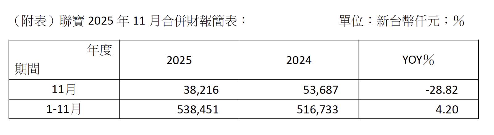 聯寶電子股份有限公司(以下簡稱”聯寶”,股票代號6821)公布2025年11月合併營收達3,822萬元,較上月減少10.27%。累計2025年1至11月合併營收為5.38億元,較去年同期成長4.2%,續創歷年同期新高表現。