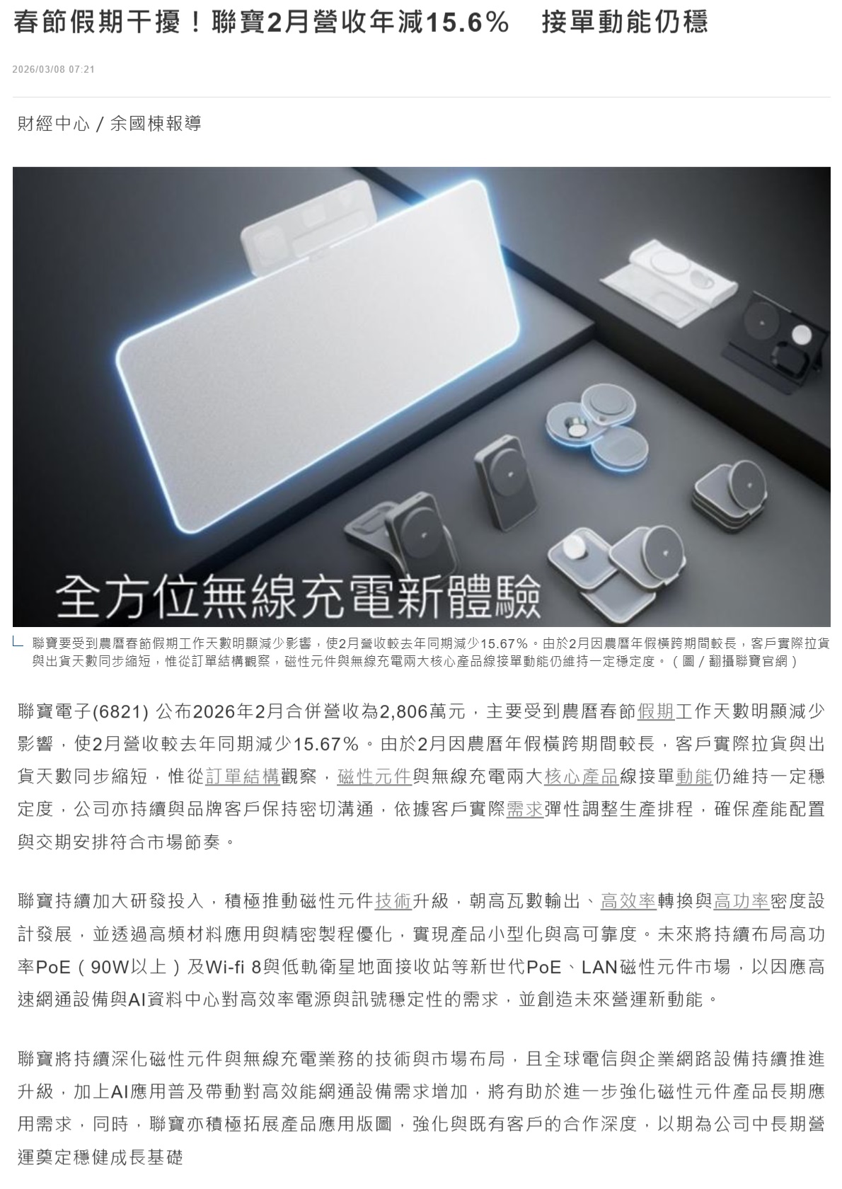 聯寶電子(6821) 公布2026年2月合併營收為2,806萬元,主要受到農曆春節假期工作天數明顯減少影響,使2月營收較去年同期減少15.67%。由於2月因農曆年假橫跨期間較長,客戶實際拉貨與出貨天數同步縮短,惟從訂單結構觀察,磁性元件與無線充電兩大核心產品線接單動能仍維持一定穩定度,公司亦持續與品牌客戶保持密切溝通,依據客戶實際需求彈性調整生產排程,確保產能配置與交期安排符合市場節奏。