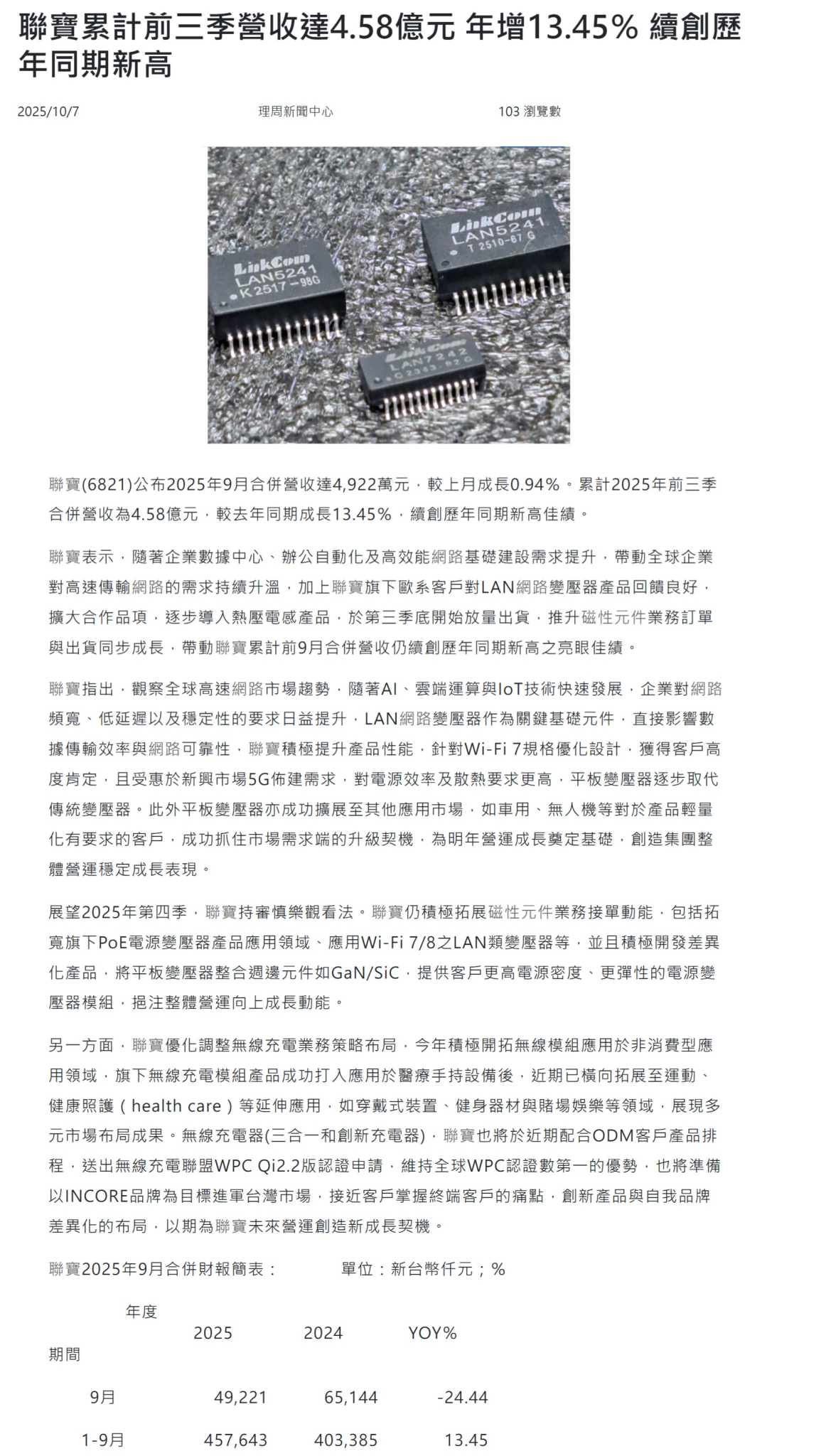 展望2025年第四季,聯寶持審慎樂觀看法。聯寶仍積極拓展磁性元件業務接單動能,包括拓寬旗下PoE電源變壓器產品應用領域、應用Wi-Fi 7/8之LAN類變壓器等,並且積極開發差異化產品,將平板變壓器整合週邊元件如GaN/SiC,提供客戶更高電源密度、更彈性的電源變壓器模組,挹注整體營運向上成長動能。
