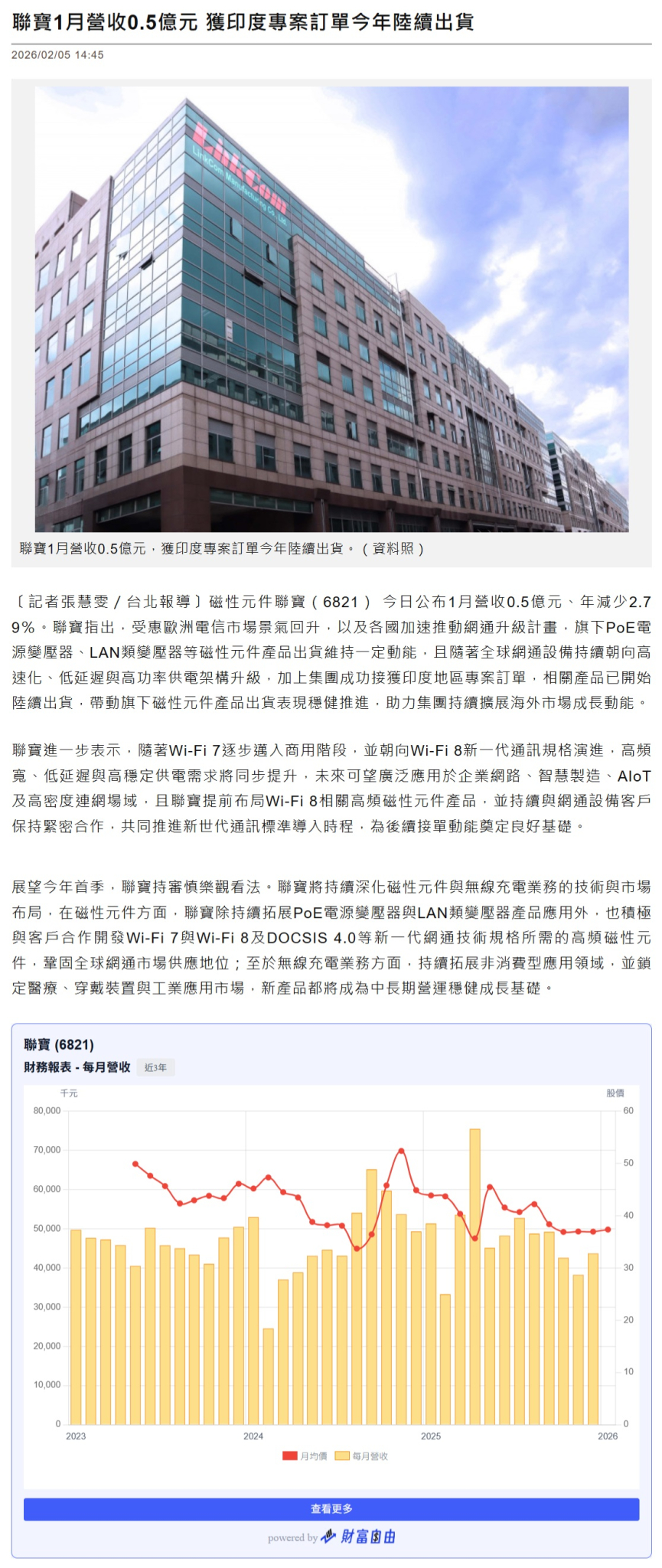 展望今年首季,聯寶持審慎樂觀看法。聯寶將持續深化磁性元件與無線充電業務的技術與市場布局,在磁性元件方面,聯寶除持續拓展PoE電源變壓器與LAN類變壓器產品應用外,也積極與客戶合作開發Wi-Fi 7與Wi-Fi 8及DOCSIS 4.0等新一代網通技術規格所需的高頻磁性元件,鞏固全球網通市場供應地位;至於無線充電業務方面,持續拓展非消費型應用領域,並鎖定醫療、穿戴裝置與工業應用市場,新產品都將成為中長期營運穩健成長基礎。